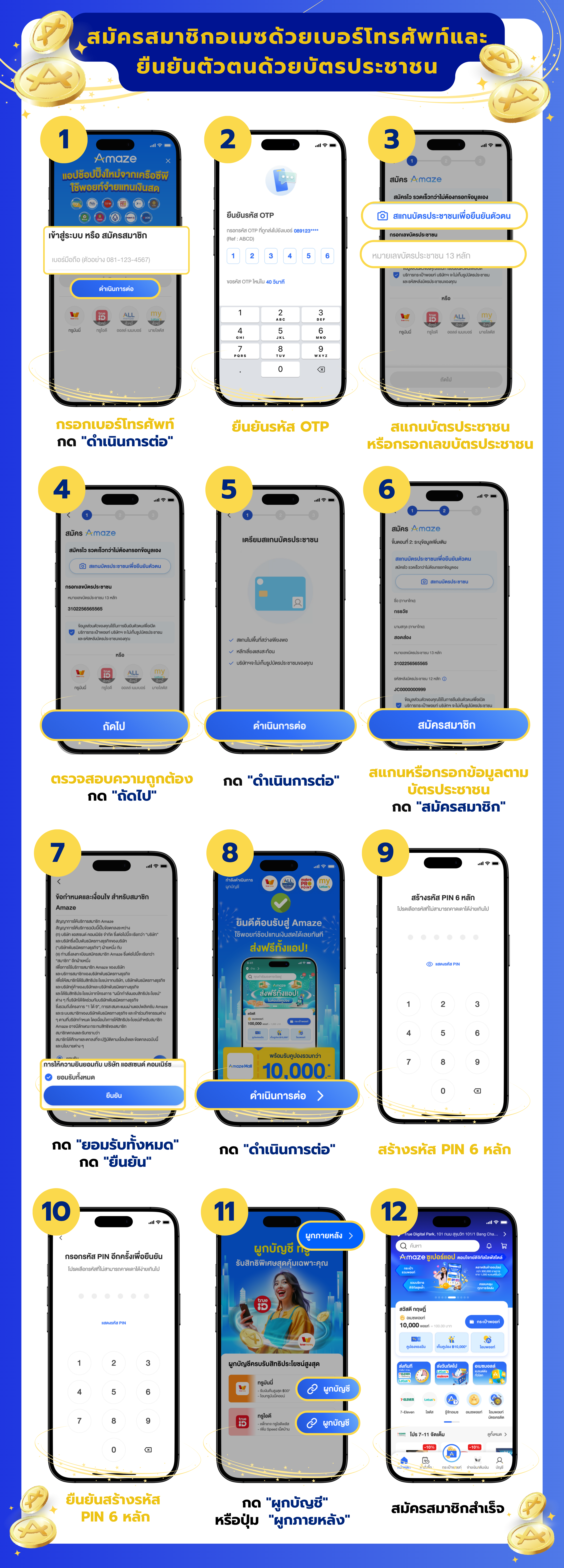 คุณสามารถสมัครสมาชิกอเมซด้วยเบอร์โทรศัพท์และยืนยันตัวตนด้วยบัตรประชาชน ตามขั้นตอนดังนี้