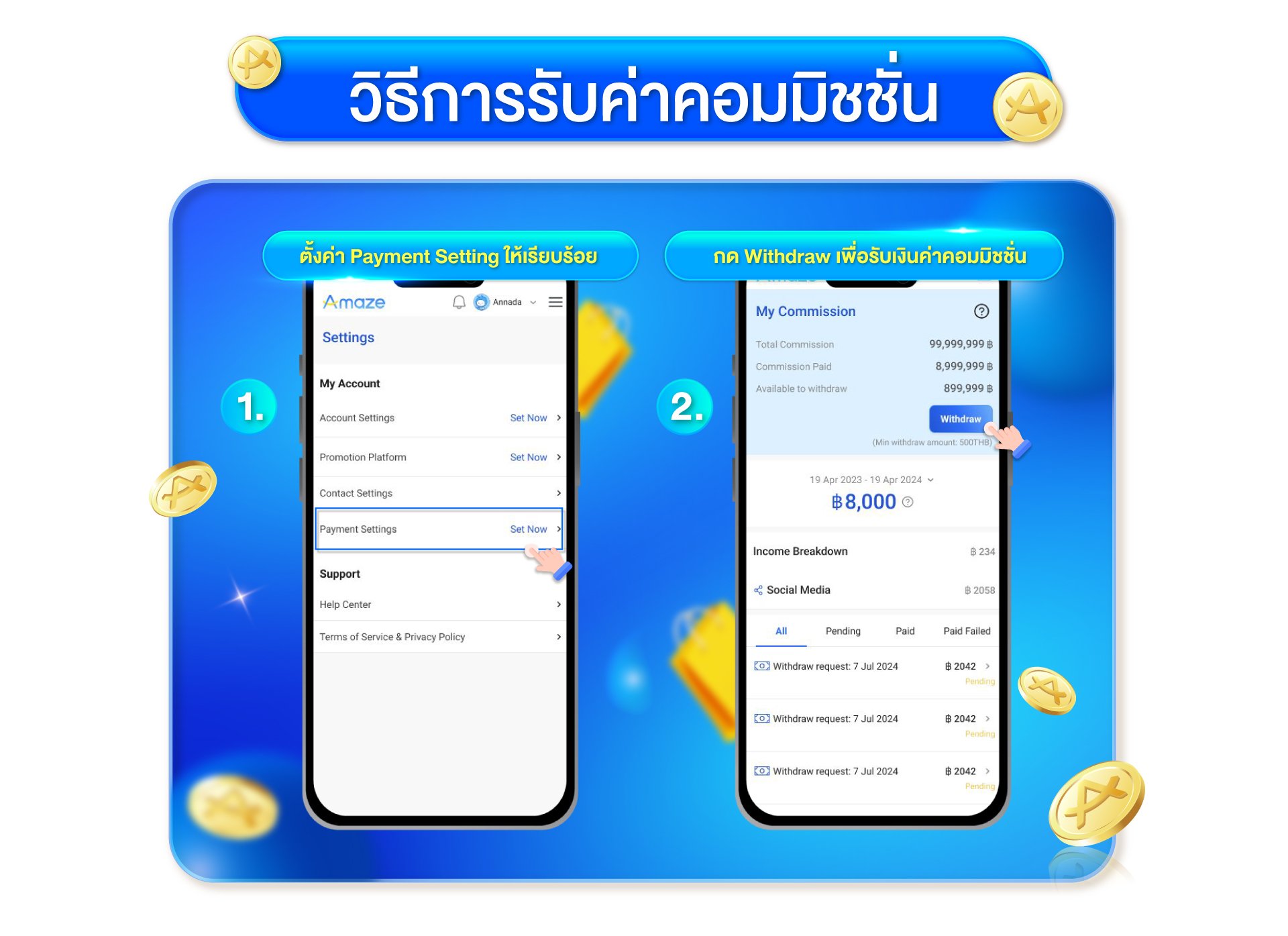 - หลังจากกรอกข้อมูลทำจ่ายแล้ว อเมซจะตรวจสอบข้อมูลเมื่อมียอดค่าคอมมิชชั่นถึงขั้นต่ำ 500 บาท